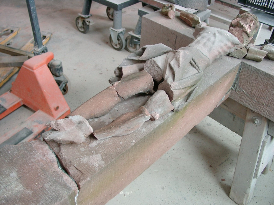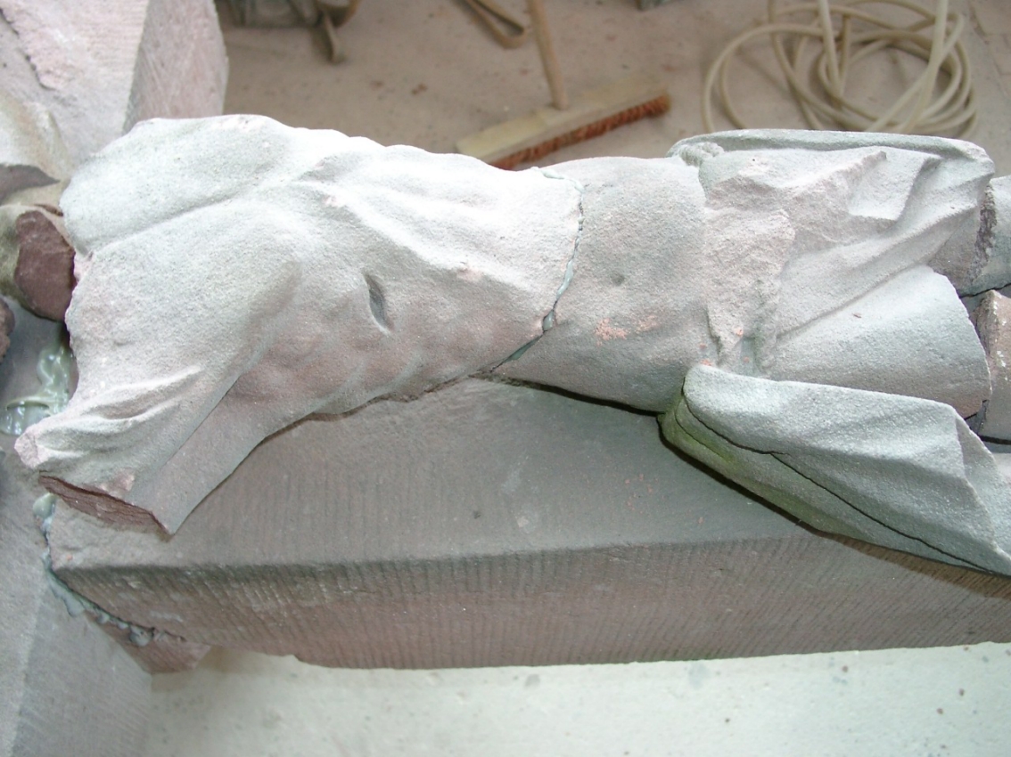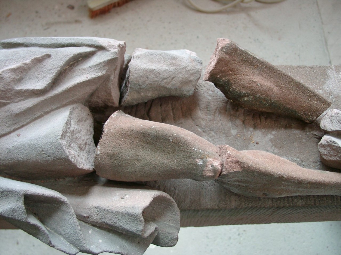 Nach Aushärten der"tragenden Teile" konnten nun die Bruchstücke des Korpus zugeordnet werden und in einem 3 dimensionalen Puzzle wieder zu einer Einheit zusammengefügt werden. Alle Verklebungen wurden mit einem 2 Komponenten Kleber ausgeführt, überstehende Kleberreste nach dem Aushärten ca 5 mm tief ausgefräst und mit einem der Körnung des Sandsteins entsprechenden Restauriermörtelaufgefüllt und überarbeitet