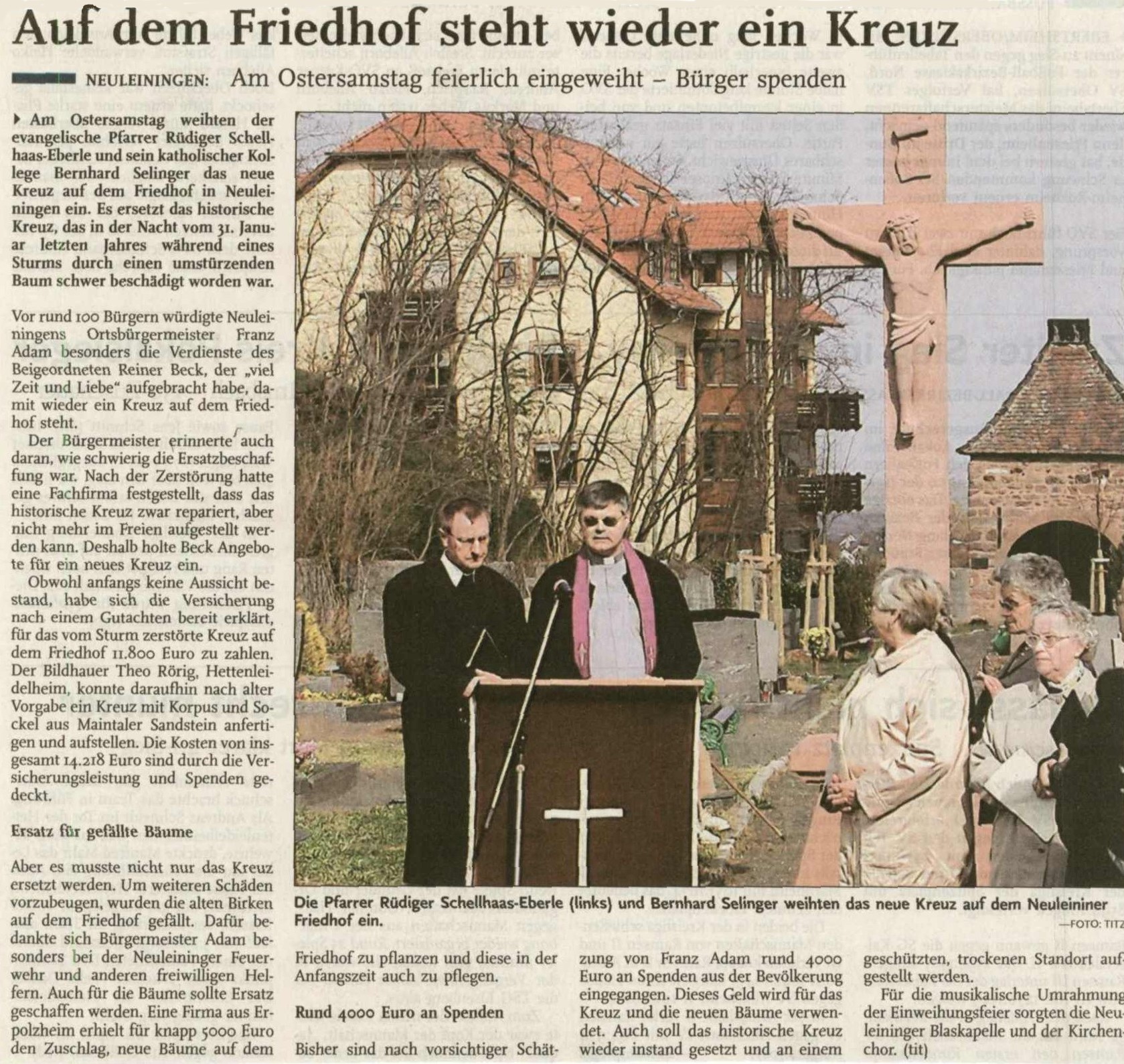 In der Nacht vom 31.Januar 2002 auf den 1.1.2003 wurde das historische Kreuz auf dem Friedhof in Neuleiningen durch einen oder mehrere in Folge eines Sturms herunterfallenden Äste eine Baumes zerstört